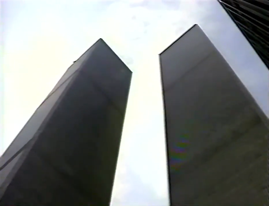 At 1 hour 13 minutes Dorothy and friends arrive at the Emerald City, which includes the WTC towers in its skyline. There is a big production number in the plaza below the towers that follows. (Shot 1, Shot 2) We also see the towers with an addition joining them.